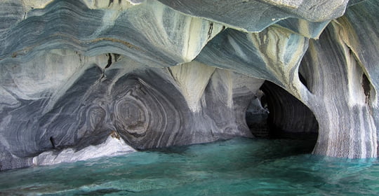 O lugar também é conhecido como Catedral de Mármore e fica localizado na patagônia chilena e é considerada uma das cavernas mais bonitas do mundo. Elas foram esculpidas pelas águas e suas paredes de mármore com uma coloração rosa e azul formam uma paisagem completamente única que dão um contraste incrível com a água, que por sua vez quando entra em contato com os raios de sol provocam um show de luzes. Por ser um local turístico e protegido a extração do mármore ali é proibida.